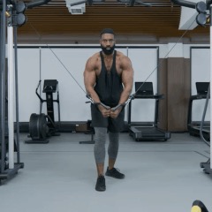 1. Stand facing the cable machine, rope attached to the cable pulley at the highest position.