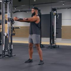1. Stand between two cable machines, feet staggered, pulleys to the lowest setting.