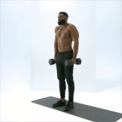 1. Stand with feet shoulder-width apart, a dumbbell in each hand at your sides.