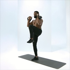 4. Jump your feet back to a squat, pick up the dumbbell, and press it overhead with your right hand.