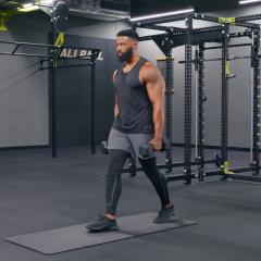 4. Begin walking forward straight, keeping the dumbbells close to your body.