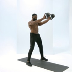 1. Begin in a standing position, holding a dumbbell in each hand at your sides.